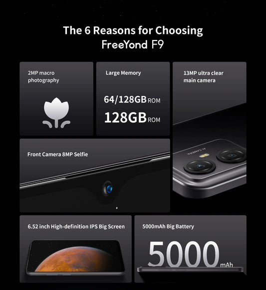 FreeYond-F9 Dual SIM Android Smartphone, 64GB, 6.52 "HD + Screen, Octa Core, 13MP Dual Camera, 5000mAh