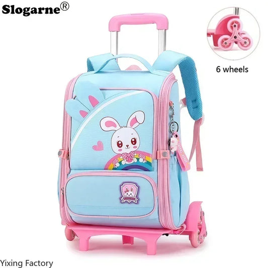 Children's Fashion Cartoon School Bags with 6 Wheels Trolley Backpack Teenagers Girls Rolling Backpack Students Kids Backpack