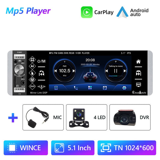 Podofo 1DIN MP5 Player Touch Autoradio FM 4-USB 5,1 Zoll, Unterstützt Android Mirrorlink Bluetooth Carplay Autoradio DVR