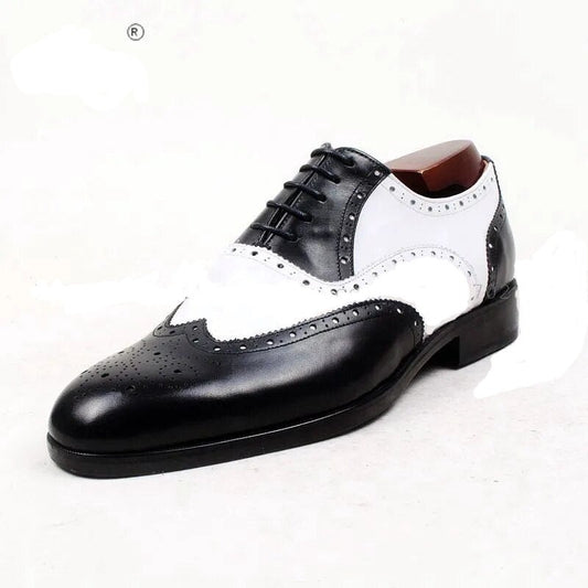 Maßgeschneiderter Lederschuh mit runder Zehenpartie, Medaillon, Weiß, Schwarz, gemischte Farben, 100 % echtes Kalbsleder