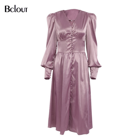 Bclout Elegant Satin Single-Breasted Shirt Dress Fashion Beige Slim V Neck Long Dresses Woman Latern Sleeve Autumn Winter Robe