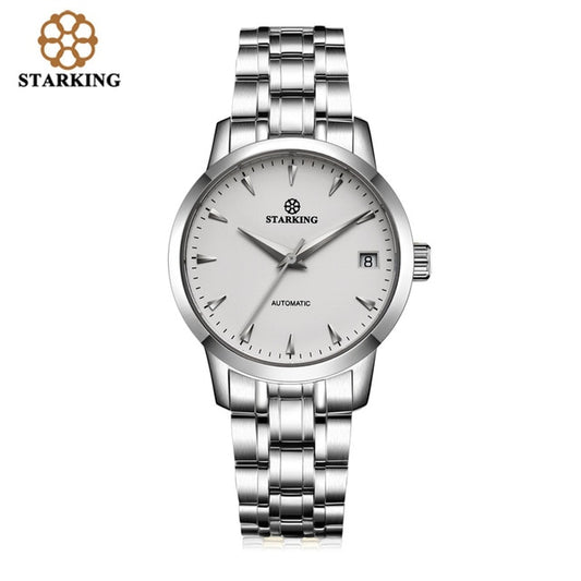 StarKing Klassische Frauen, Einfache Uhr Automatisch aus Edelstahl, Weißes Zifferblatt Armbanduhr, Auto Datum Damen Mechanisch Relogio Feminino