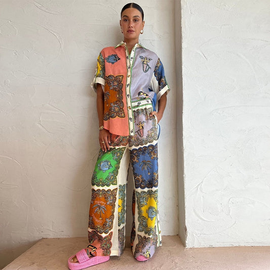 Damen-Set mit lockerem Hosen-Aufdruck, lässig, einreihig, Umlegekragen, kurze Ärmel, T-Shirts, Empire-Schnürung, weites Bein