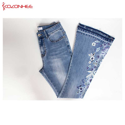Stickerei Stretching Flare Damen Jeans, elastische Schlaghosen große Größe