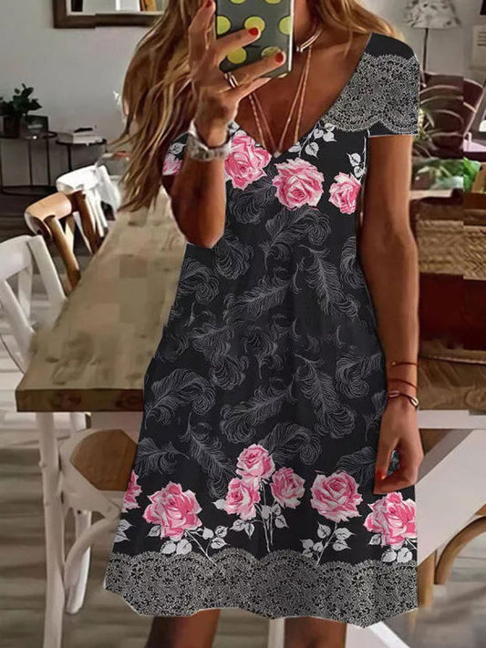 2023 Sommer Damen Mini Kleid mit V-ausschnitt, Kurzarm Kleid mit Sexy Blumen Druck