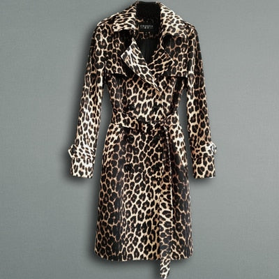 Britische Leopard Damen Mantel mit Gürtel, Zweireiher Lange Windjacke