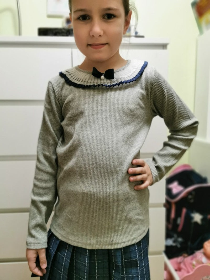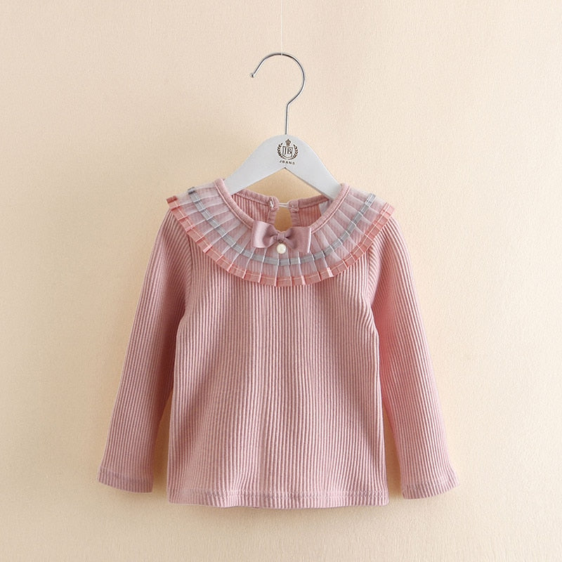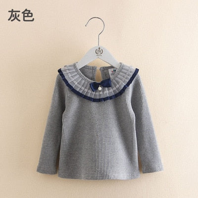 Langarm Plissee Umlegekragen Hals T-Shirt Für Mädchen, 100% Baumwolle Weiß Grau Einfarbig