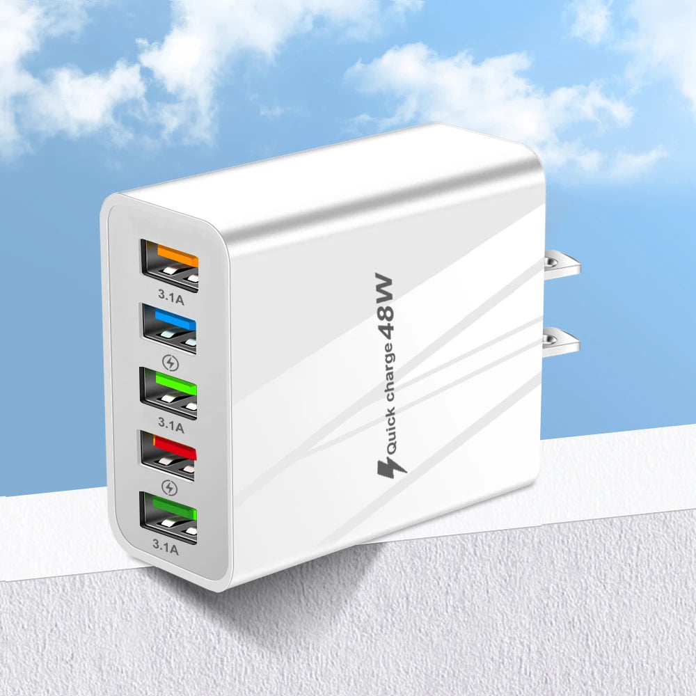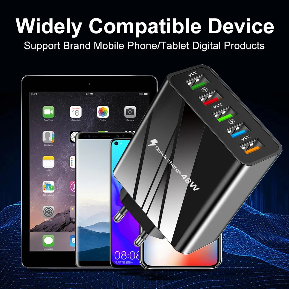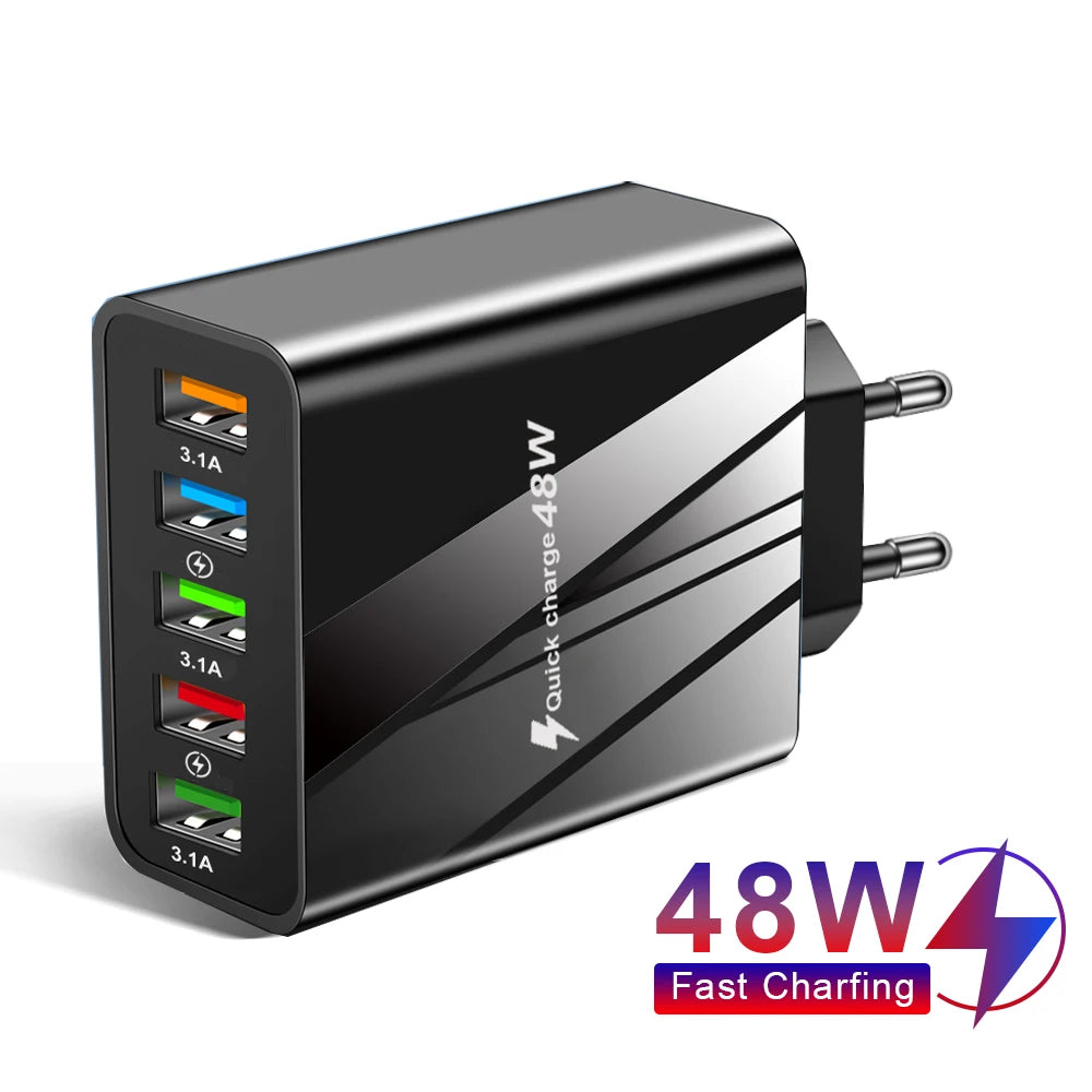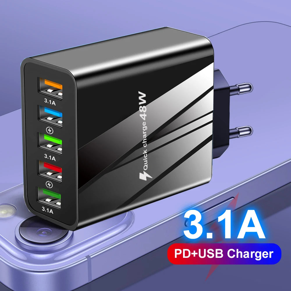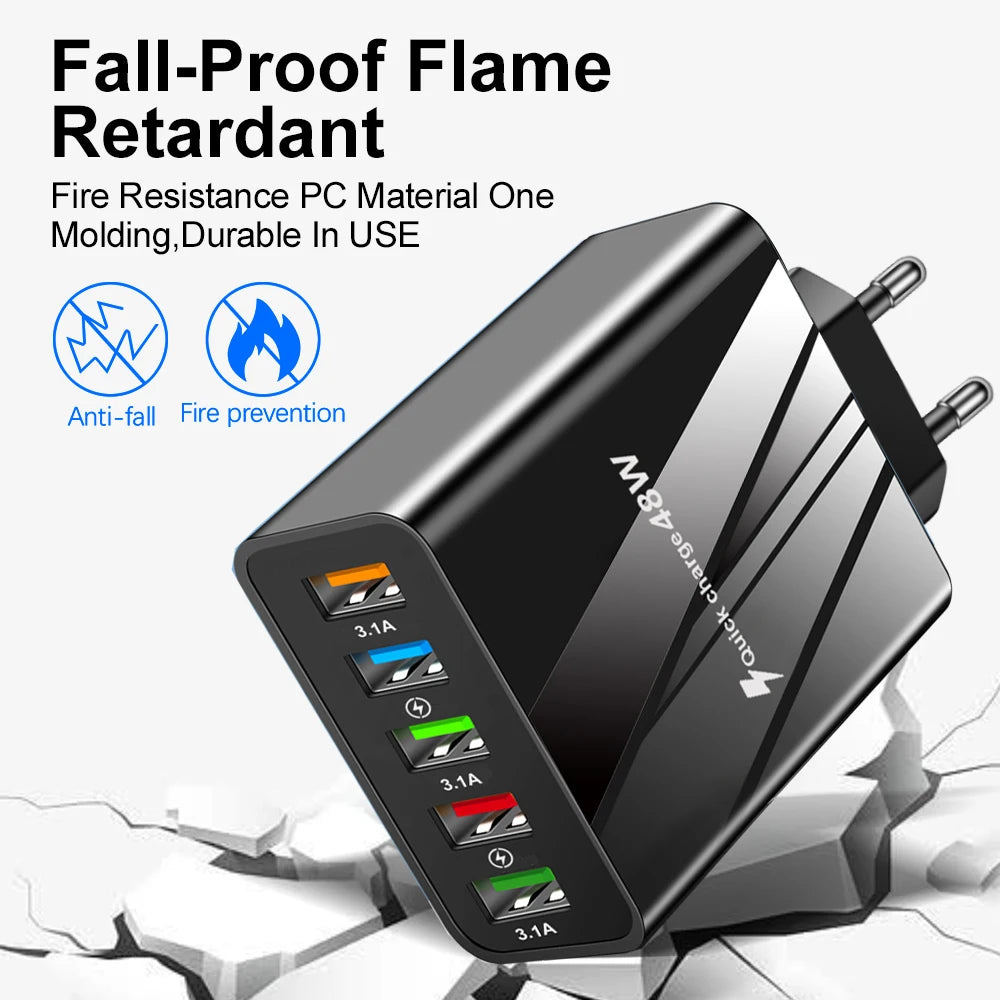 48W USB Charger Fast Charge QC 3.0 Wall Charger Adapter For iPhone 14 13 Samsung Xiaomi Mobile Phone Charger 5 Ports EU US Plug