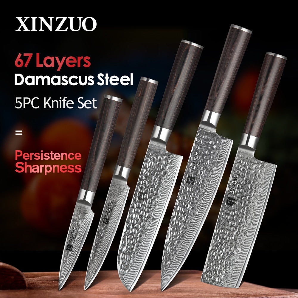 XINZUO 5PCS Kitchen Knives Set Japanese Damascus Stainless Steel New designed Knife Cleaver Nakiri Knife with Pakkawood Handle
