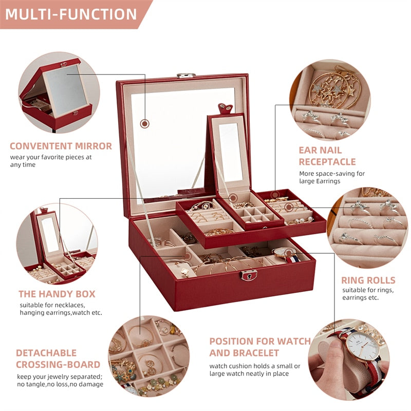 - Schmuckkästchen mit verschiedenen Ebenen:Die Schmuckkästchen hat drei Schichten. Die obere Ebene ist das Tablett mit Rillen für Ringe, herausnehmbaren Stifttabletts und Ablagen für Uhren. Die unteren beiden Ebenen sind Schubladen mit herausnehmbaren Trennwänden, die Sie je nach Größe Ihres Schmucks nach Belieben verwenden können.