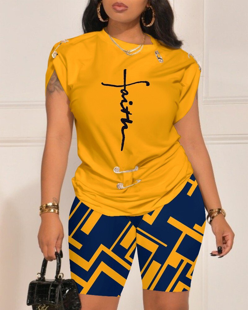 Damen Casual Rundhals Kurzarm T-shirt, Mode Druck in Zwei Stück Anzug-Set