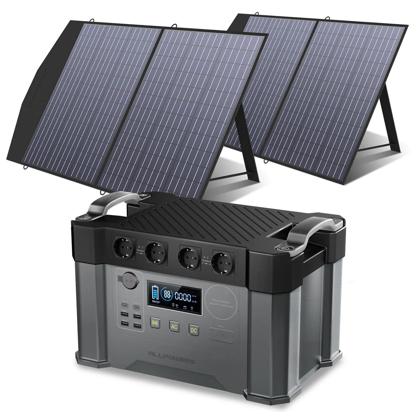 Dazu kommen 2 x 100 W tragbare Solarpanele für den Außenbereich, die Sie überall hin mitnehmen können. Erleben Sie die Freiheit, nie mehr ohne Strom zu sein!