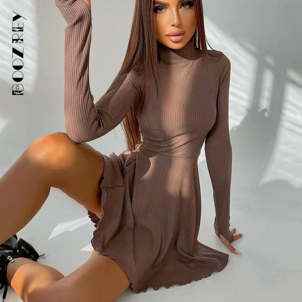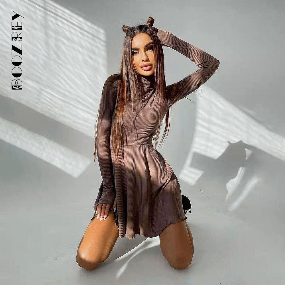 Elegante, solide Kleider für Damen, langärmelig, gestrickt, A-Linie, Faltenrock, lässig, Streetwear mit Rollkragen