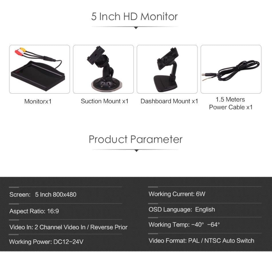 Auto LKW Bus 5 Zoll 12V 24V HD LED Stand Monitor Bildschirm mit Rückansicht, Rückfahrkamera, Parken Kit Combo Home CCTV