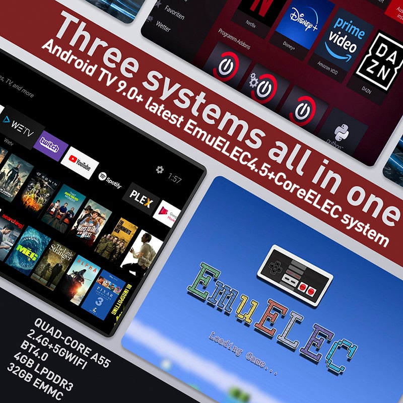 - 3 IN 1: Super Console X Max drei Systeme in einem, Android TV 9.0+ neuestes EmuELEC 4.2+CoreELEC-System, spielen Sie nicht nur klassische Retro-Spiele, Online-Spiele, sondern sehen Sie sich auch kostenlos Fernsehfilme an, laden Sie Apps herunter usw. Aktualisierter S905X3-Chip , Viel leistungsfähiger, das Frame-Drop-Problem gelöst. Und es ist bequem, das Speichern des Spielfortschritts jederzeit zu unterstützen.