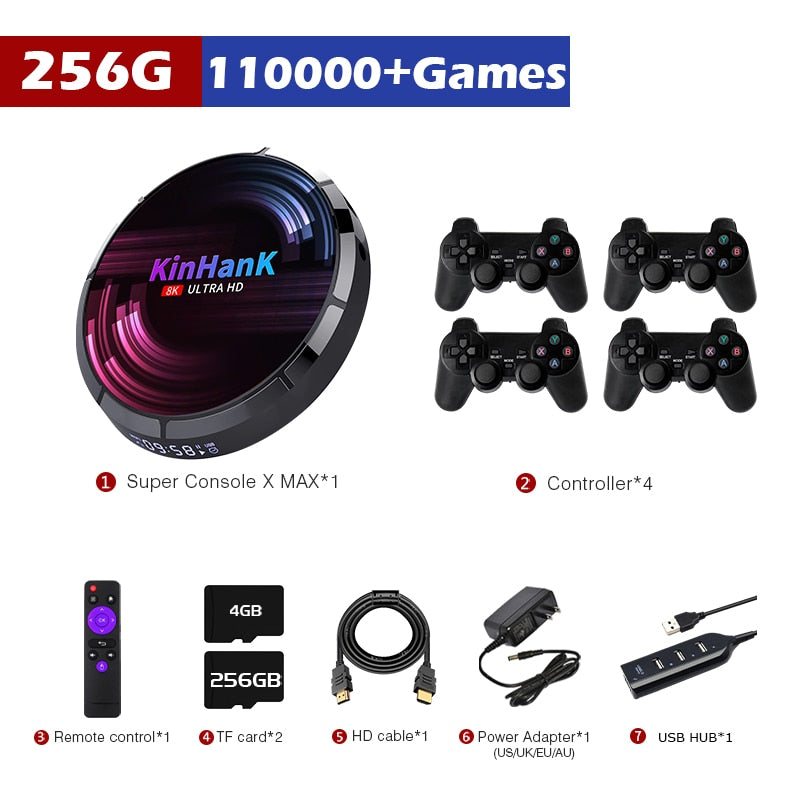 - 4K HD/AV-AUSGANG: Super Console X MAX Videospielkonsole ist geeignet für 4K-Fernseher, unterstützt HD/AV (1080P/720P)-Ausgabe und 26 Sprachen. Wir können ganz einfach lebendige und aufregende Videos und Spiele auf einem großen Bildschirm genießen.