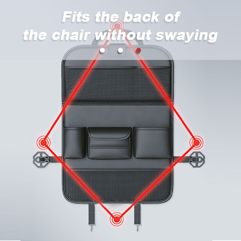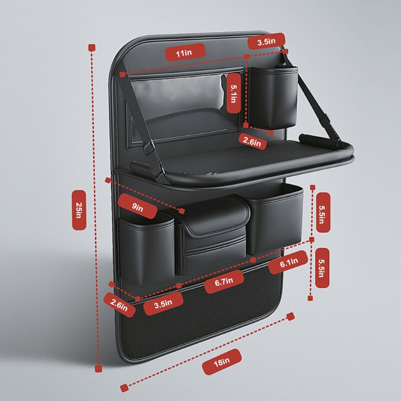 Der Autositz-Rückenlehnen-Organizer bietet eine einzigartige Kombination aus einer Auto-Rücksitz-Aufbewahrungstasche, einem faltbaren Tischtablett, einem Tablet-Halter und einer Taschentuchbox.