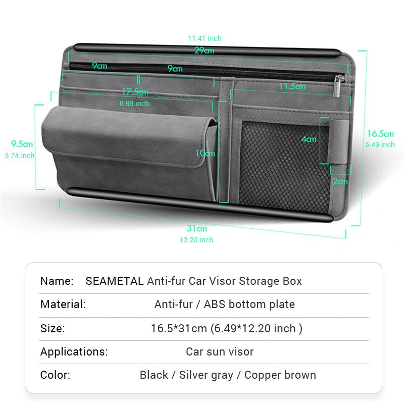 Unser Auto-Sonnenblenden-Organizer ist aus strukturiertem Wildleder mit einer 2-lagigen Aufbewahrungstasche und einem integrierten Sonnenbrillenetui & Kartenhalter.
