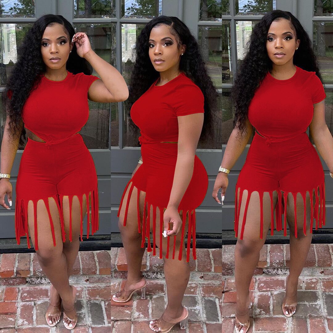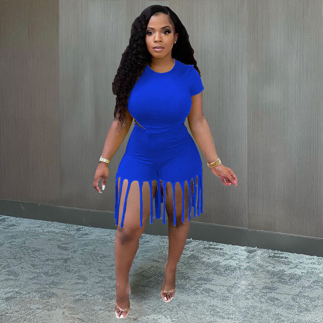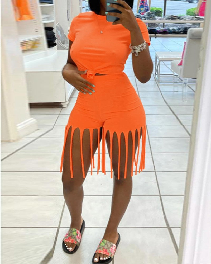 Damen 2-teiliger Kleidungsanzug, einfarbig, kurzärmelig, Shorts-Set mit Quastenbesatz und hoher Taille