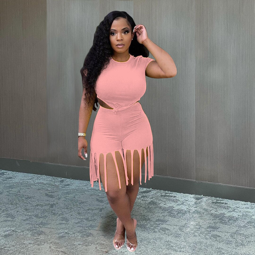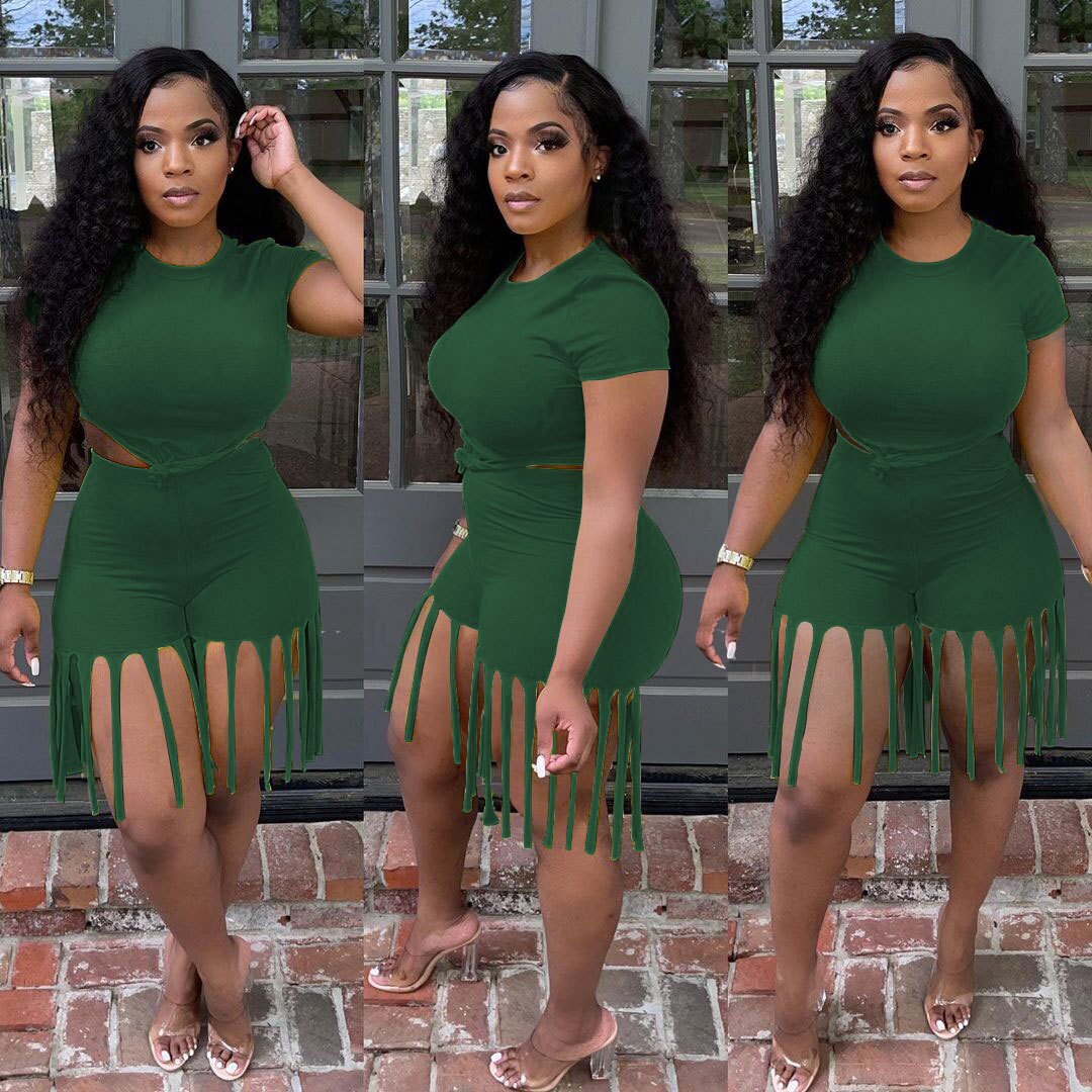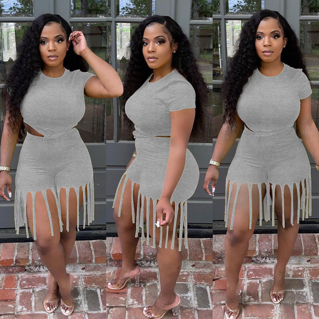 Damen 2-teiliger Kleidungsanzug, einfarbig, kurzärmelig, Shorts-Set mit Quastenbesatz und hoher Taille
