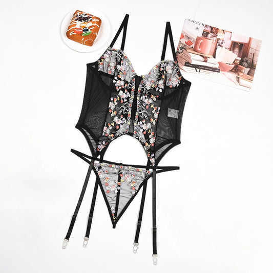 Frauen Sexy Mesh Korsett Dessous, Blumen Stickerei einteiliges Kleidungsstück, Damen G-string Body Unterwäsche mit Strumpfbänder